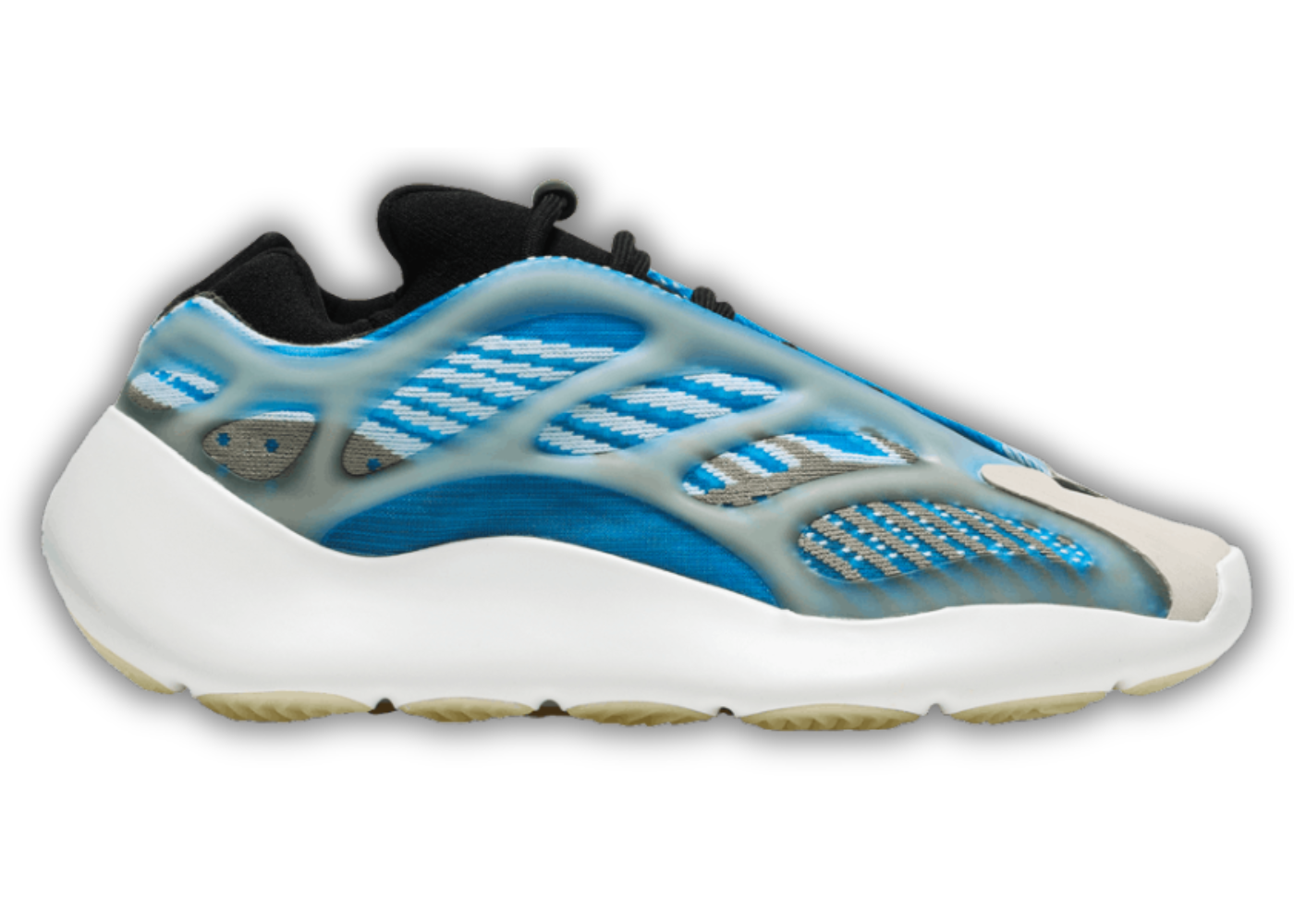 The Yeezy 700 V3 Arzareth features a blue and grey Primeknit upper that is complemented by a traditional translucent glow-in-the-dark cage overlay. From there, an EVA foam midsole, grey toe cap, and black lining complete the design.