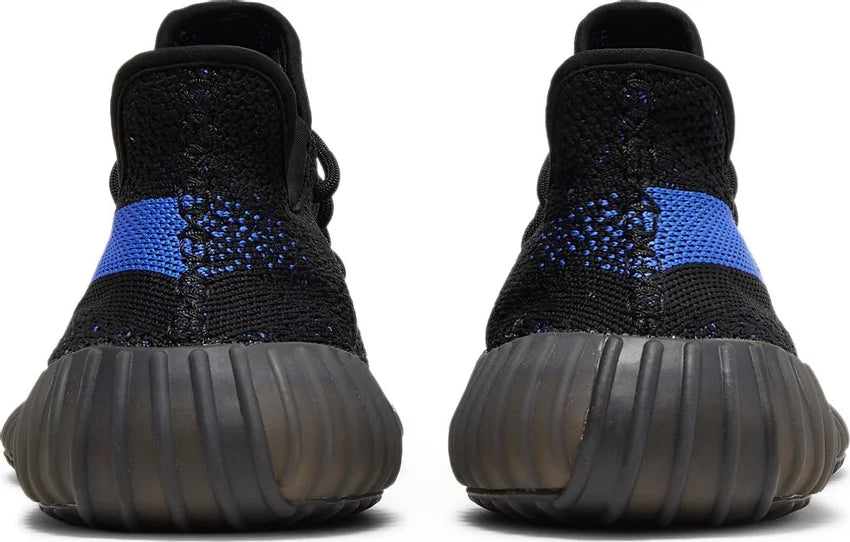 Description : The adidas Yeezy 350 V2 Dazzling Blue is reminiscent of the 2016 Yeezy 350 V2 Black Friday Pack. Instead of featuring a marbled pattern and sheer side stripe, it opts for a solid black Primeknit upper and blue side stripe with "SPLY-350" text. At the base, a muted Boost sole offers comfort and support.