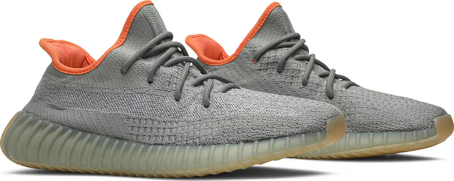 This Yeezy 350 V2 is composed of a desert sage Primeknit upper with a tonal side stripe. A translucent Boost cushioned sole and orange interior completes the design.