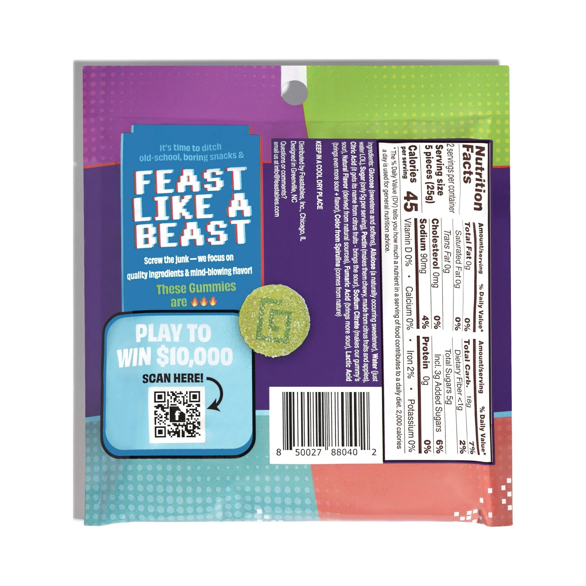 - Contains one (1) 50-gram bag of Feastables Karl Gummy Candy Sour Green Apple, perfect snack size to meet your cravings on-the-go!