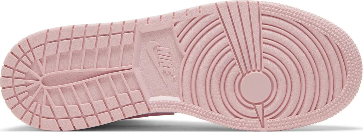 The Fierce Pink Air Jordan 1 Mid comes in grade school sizes and is designed with a combination of leather and synthetic materials, which makes it both comfortable and supportive. The midsole is made of a foam material that provides extra cushioning. The toe area has a traditional toe box shape, which is wide and includes perforations. This design ensures that the toes can move and flex naturally while still having enough ventilation.