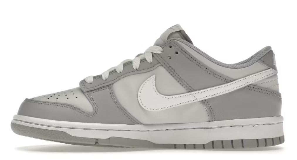 Description : Nike Sportswear added to their GS Dunk Low lineup with this Nike Dunk Low Two Toned Grey colorway, arriving in a mix of gray tones. The GS Nike Dunk Low Two-Toned Grey comes constructed in a full leather build featuring light and dark shades of gray. The clean two-toned Grey colorway sees the slightly darker shade of neutral overlaying the base layer, while the white Swoosh logo, laces, and midsole complete the two-tone look. A gray rubber outsole completes the design. The GS Nike Dunk Low Two-Toned Grey was released in March of 2022.
