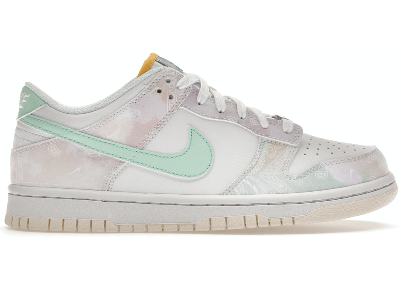 Description : With a subdued all-over print, the Nike Dunk Low Pastel Paisley GS modernizes the traditional design. The top is made of white tumbled leather, and the overlays feature a delicate pink and green paisley pattern. On the Swoosh and Nike-branded heel tab, vibrant hits of Mint Foam land, while an iridescent Nike tongue tag shimmers in turquoise, orange, and yellow. The sneaker is supported by a robust cupsole that features cream-colored rubber outsole and sidewalls with white stitching.