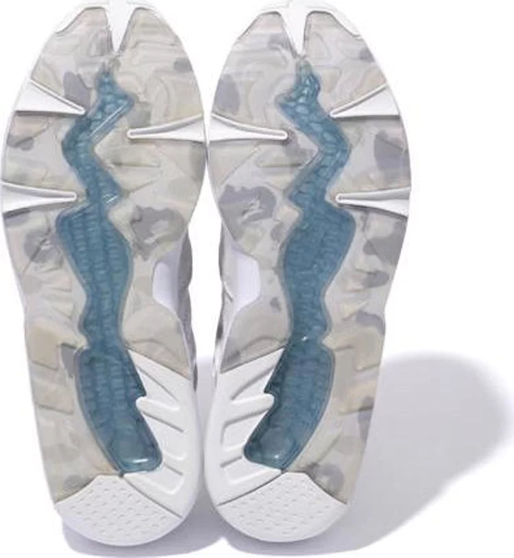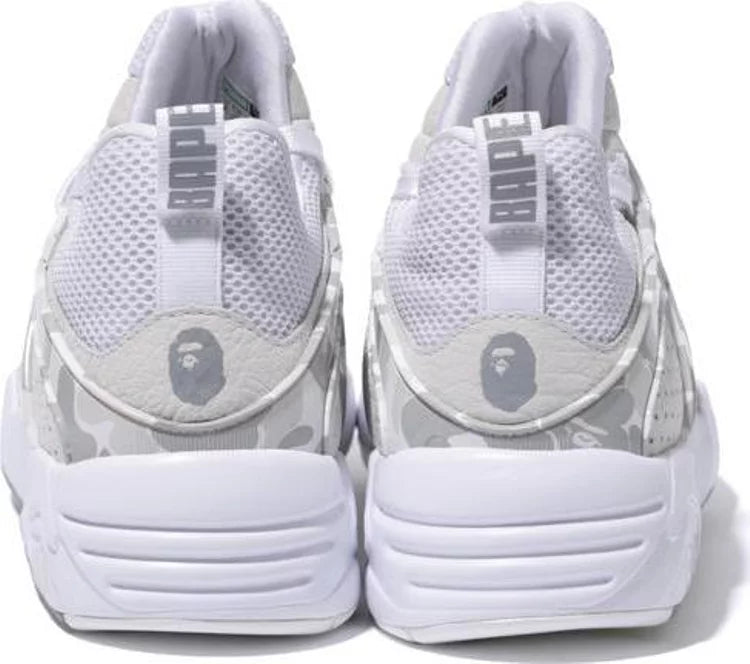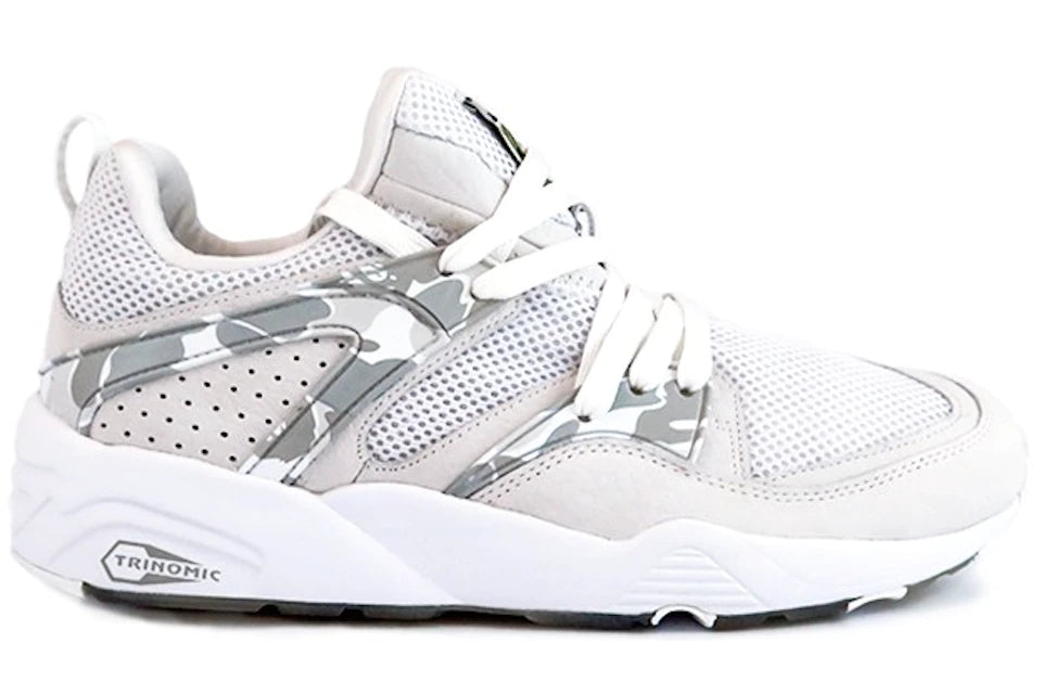 Description : Japanese brand A Bathing Ape partnered with Puma to release a range of accessories, including exclusive footwear. The Puma Blaze of Glory Bape Camo White features a Cream leather upper with white mesh underlays for breathability and a lightweight feel. The sneaker also boasts perforated detailing, Trinomic technology and an EVA rubber sole. The classic Ape Head camo detailing appears on the sides.