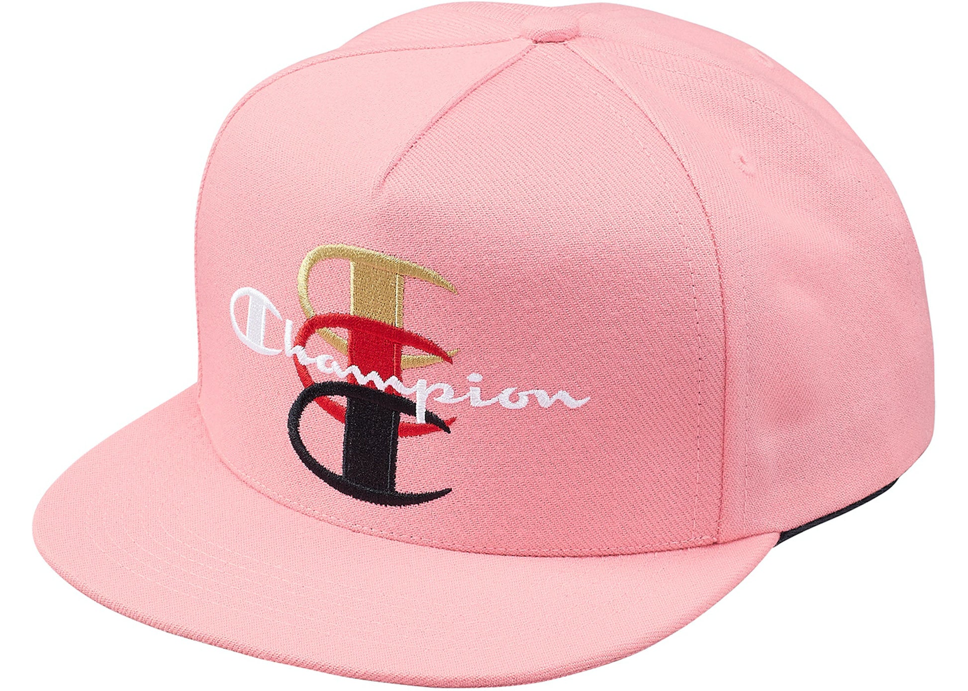 Description : Pink cotton Champion 5-panel cap from SUPREME featuring flat peak, adjustable strap to the back and embroidered logo.