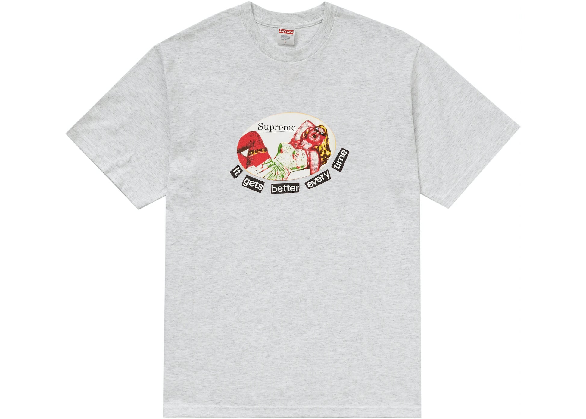 Description : Just in time for the hottest days of Summer, Supreme released their Summer Tees alongside a brand new photo tee as a part of their last drop in the month of June 2019. Released as a part of 2019's Summer Tees selection was the It Gets Better Every Time Tee which features a woman on the chest alongside the word Supreme and above the graphic lettering "It Gets Better Every Time". The Supreme It Gets Better Every Time Tee released on Thursday, June 27th, 2019.