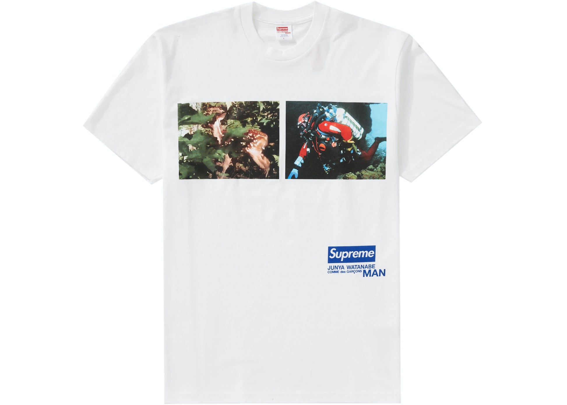 Description : Supreme's Junya Watanabe CdG Man Nature T-shirt in white was released in Week 11 of the streetwear brand's Fall/Winter 2021 season. As a whole, this Supreme x Junya Watanabe CdG Man apparel collection included more than 40 new apparel items, most of which are inspired by the legendary Japanese designer's past runway shows. This particular t-shirt features two images on its chest above a Supreme x Junya Watanabe CdG Man logo. The white Supreme Junya Watanabe CdG Man Nature T-shirt was released on November 4th, 2021.