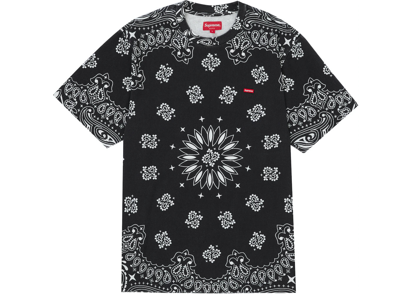 Supreme's Spring/Summer 2021 Small Box T-shirt delivery included ten colorways, some old and some new. Amongst the new colorways are the bandana print t-shirts that have been made available in black, red, brown, and light blue. The black bandana colorway of the Small Box T-shirt features a small embroidered Supreme logo on its chest and a sublimated bandana print.