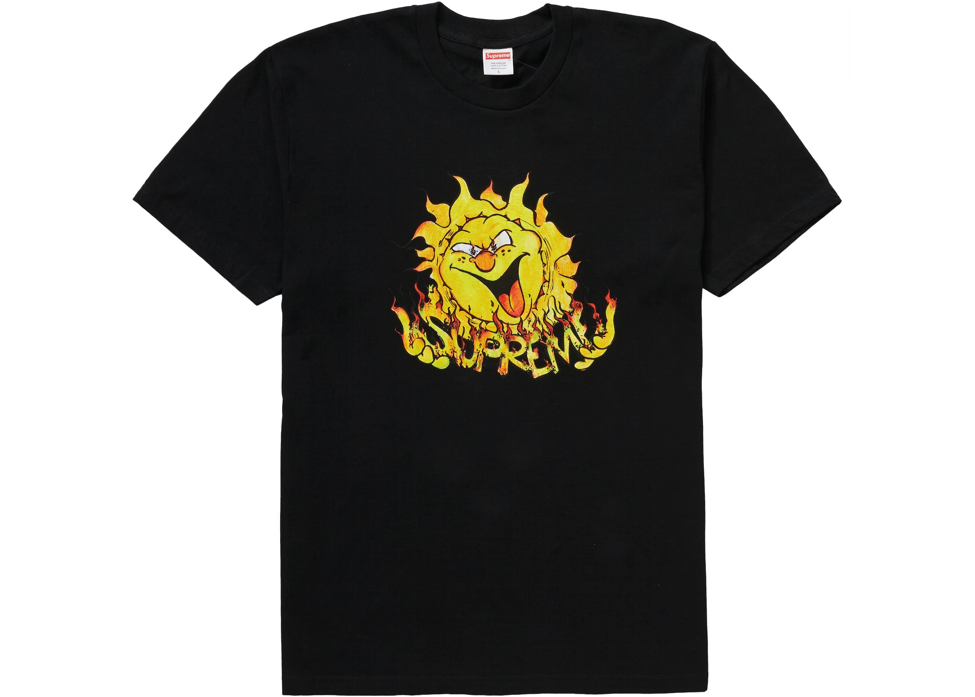 Description : This black Supreme t-shirt features a graphic of a mischievous-looking sun holding a flaming Supreme logo in his hands. The t-shirt dropped on October 8th, 2020, as a part of Supreme's fall tees release which included a new never-before-seen box logo t-shirt and a Smurfs t-shirt. The Supreme Sun T-shirt dropped as a part of the brand's FW20 Week 7 release.