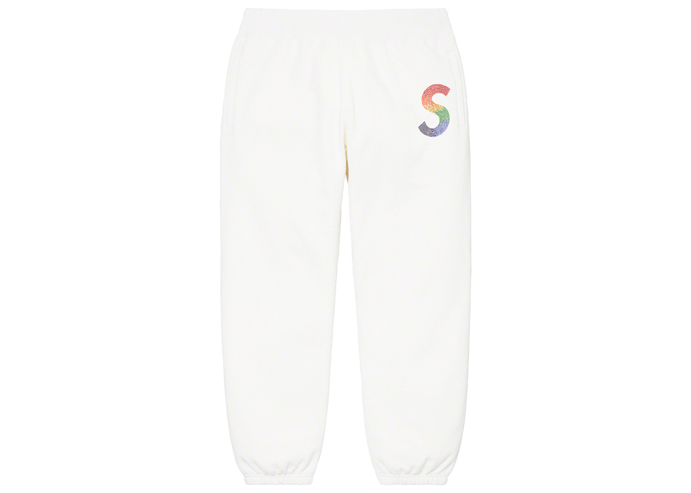 These white Supreme Swarovski S Logo Sweatpants released on April 1st, 2021.