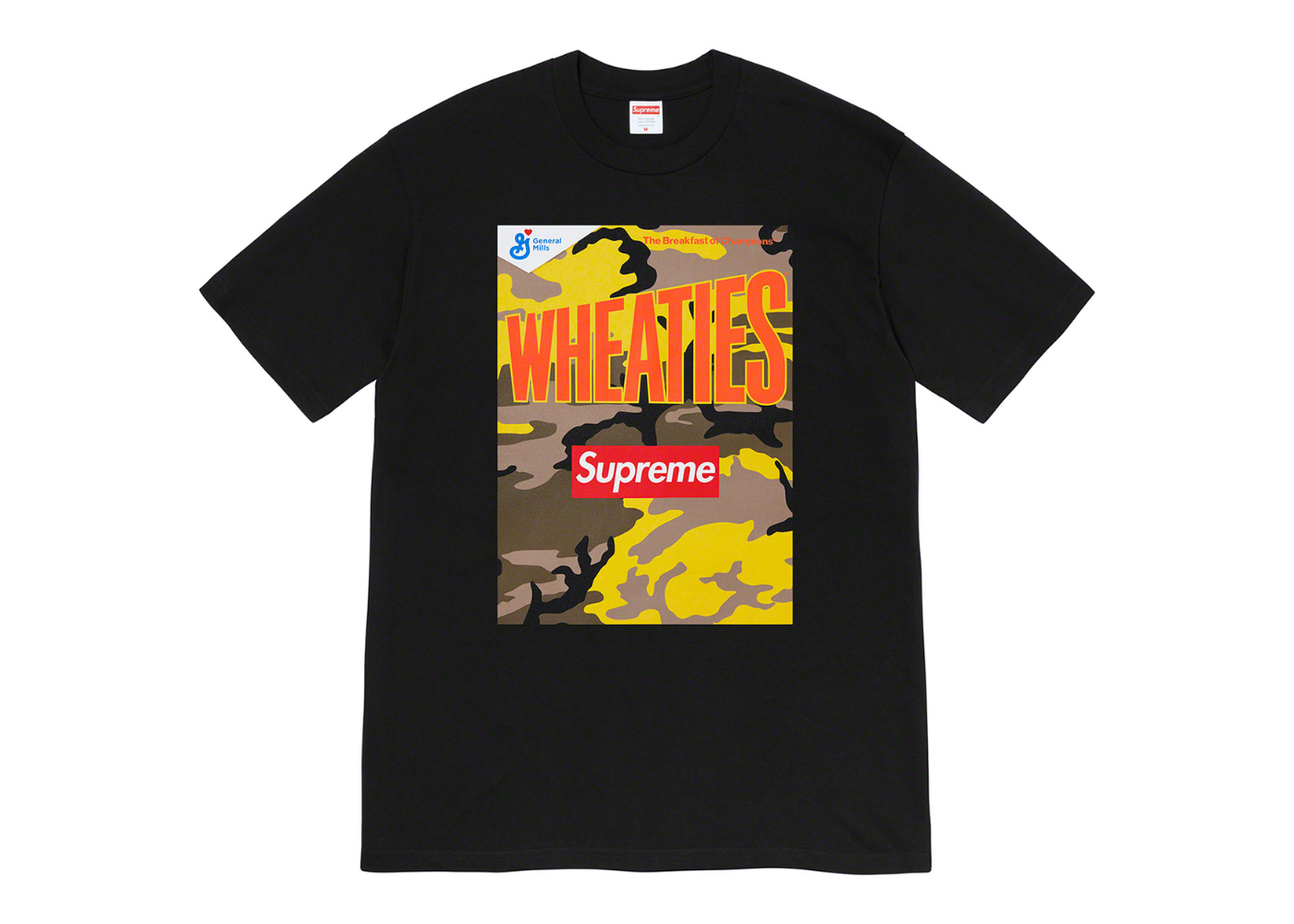 Description : The black Supreme Wheaties T-shirt was released in Week 6 of the streetwear brand's Spring/Summer 2021 season. This Supreme t-shirt features imagery of the streetwear brand's yellow Wheaties box on a black t-shirt. A white version of this Supreme Wheaties T-shirt was also released and its graphic features the purple box of cereal.
