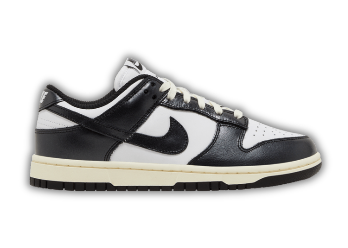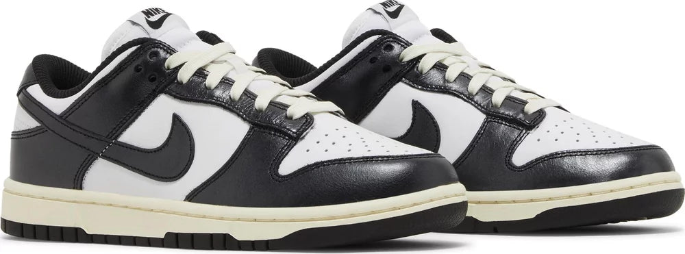 Description : Due to the rubber midsole's antique off-white finish, the Women's Nike Dunk Low Vintage Panda has an aged appearance. The smooth leather construction of the throwback silhouette's upper features a clean white foundation with black overlays that contrast and a color-matched Swoosh. The nylon tongue is decorated with a woven Nike tag, and the back tab features an embroidered Nike wordmark. The sneaker is supported by a solid black rubber outsole that is gripping.